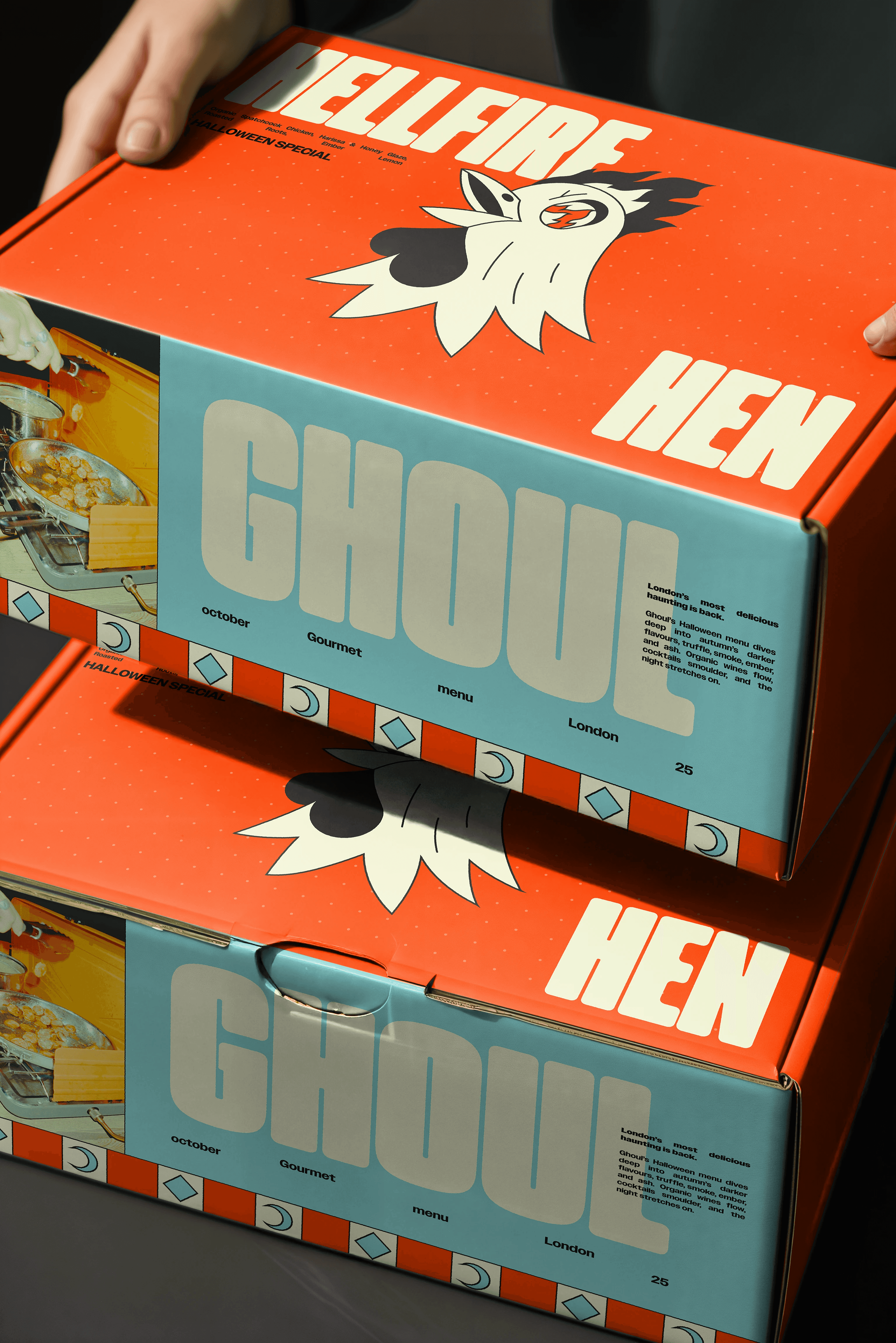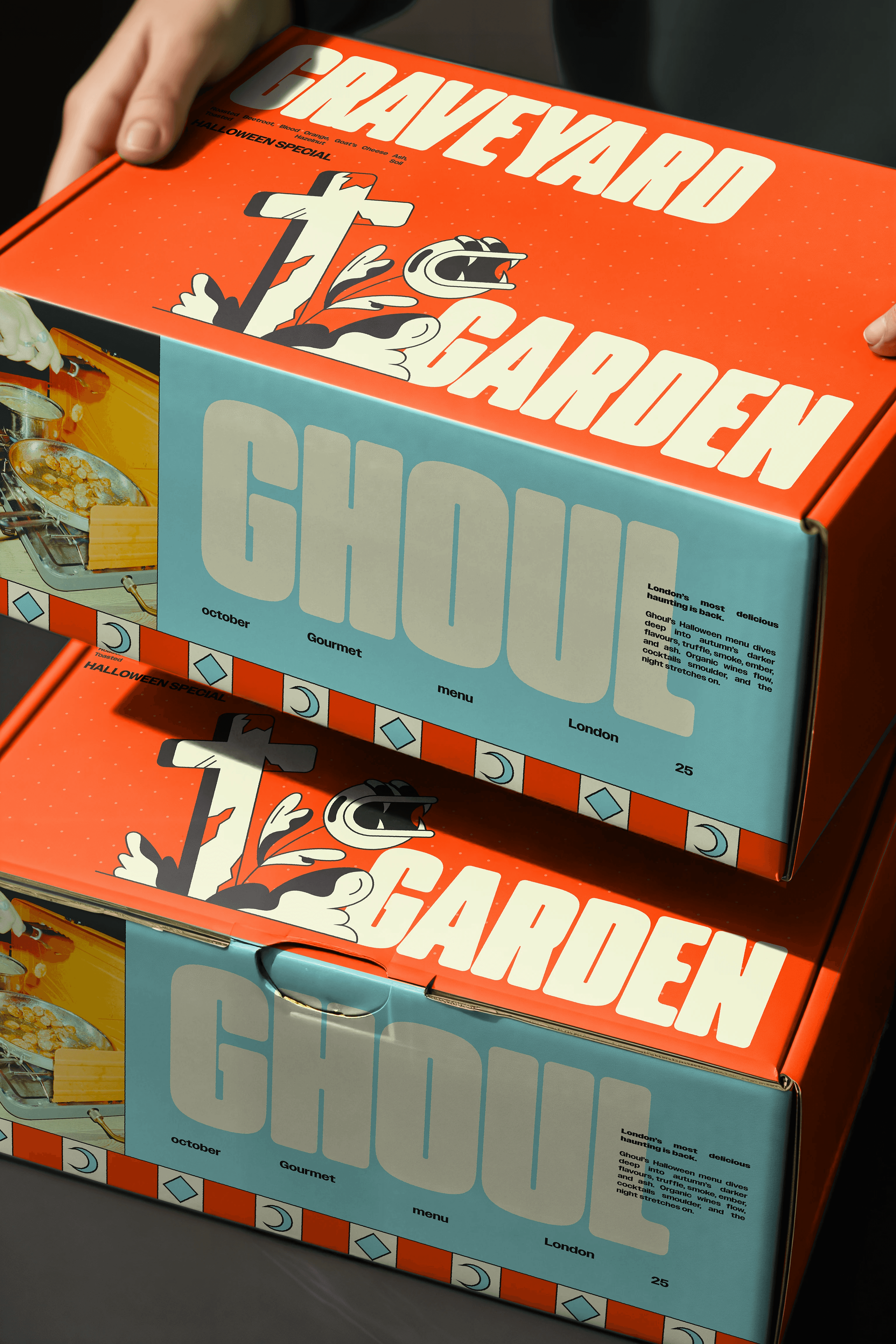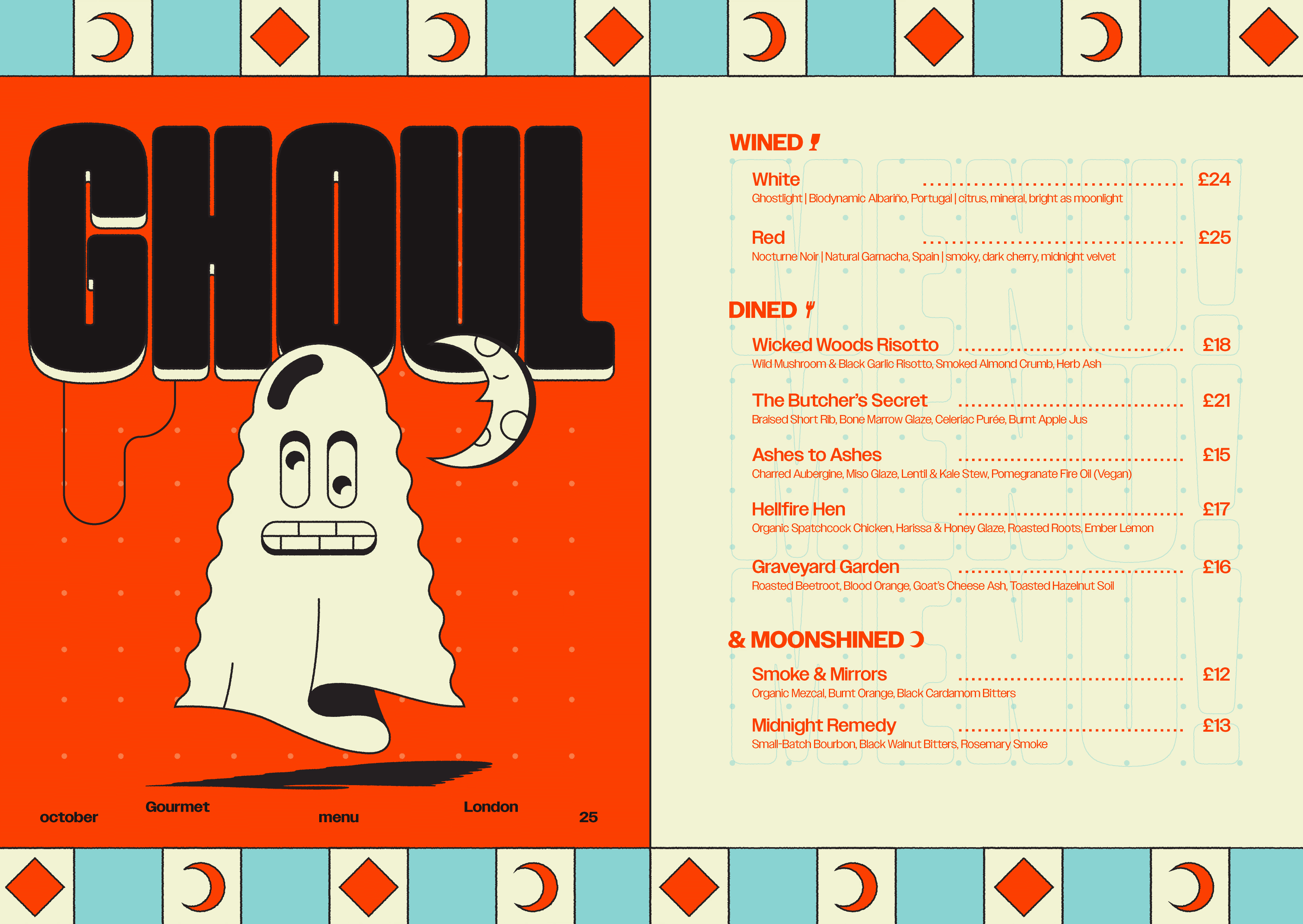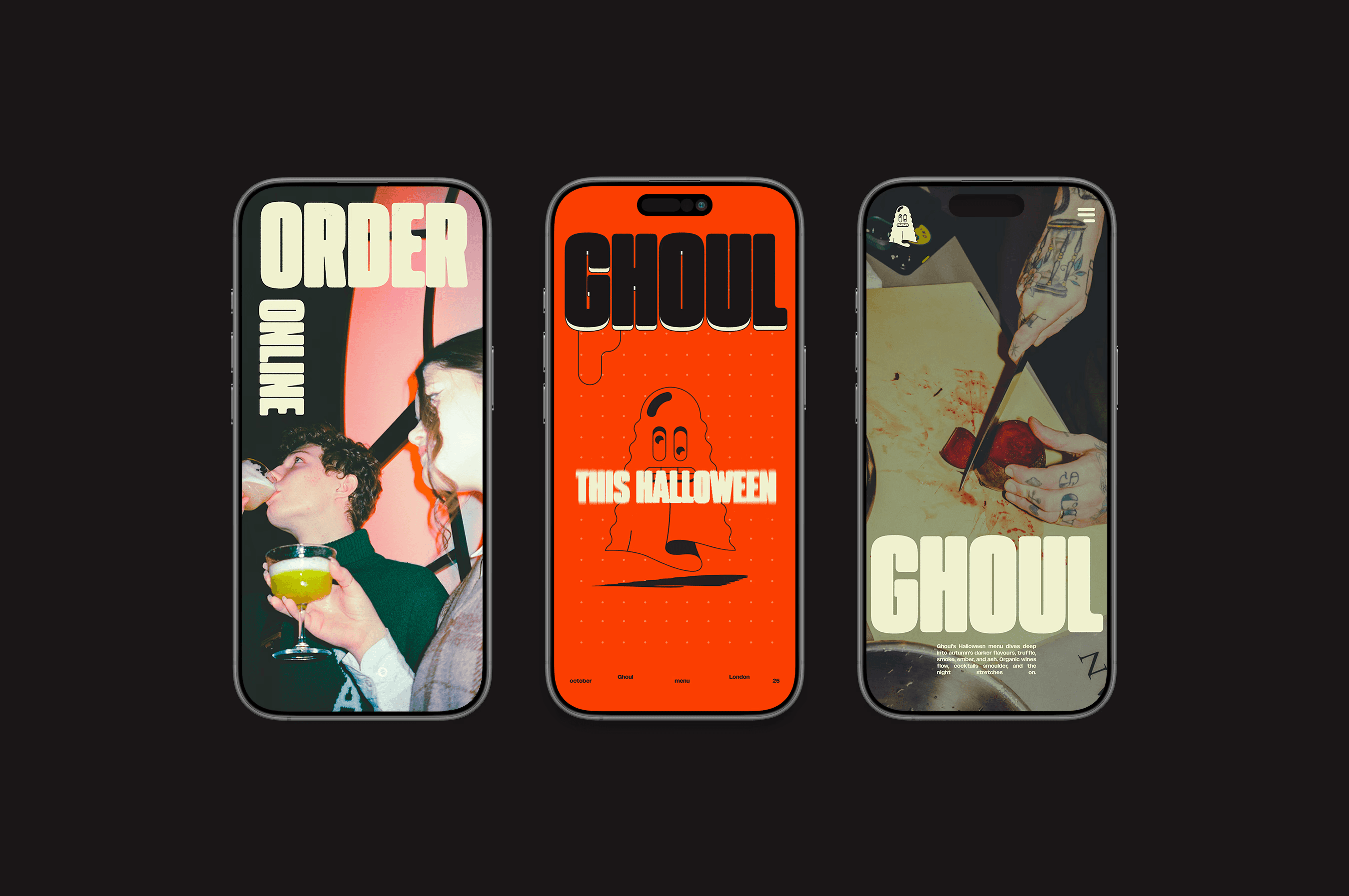 Art direction & design for a special edition Halloween menu for a speculative London based food and beverage delivery service. The visual language was designed to feel contemporary while still embracing seasonal Halloween cues, balancing playfulness with a refined, modern tone.
